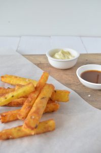 Haal de frietjes met een schuimspaan uit de pan als ze mooi bruin gebakken zijn. Leg ze op een vel keukenpapier en strooi er meteen wat zeezout overheen. Dien de frietjes op met je favoriete saus. Wij aten ze met truffelmayo – zelf gekocht – en dat was een lekkere combi.