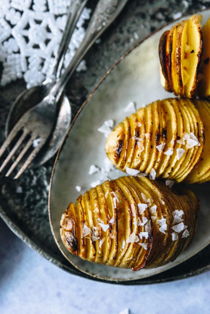 Aardappelen eet ik het liefst – niet verder vertellen – in patatvorm. Jammie. Maar ja, vaak patat eten is niet goed voor je. Zeker niet als je, zoals ik, graag lekker veel mayonaise en curry toevoegt aan die patat. De aardappel is gelukkig een hartstikke veelzijdig product, je kunt ‘m op veel manieren bereiden. Hij is bij ons in de keuken echt weer aan een opmars bezig. We eten ‘m gebakken (dan lijkt ‘ie namelijk het meest op patat), gekookt, met en zonder dressing, gepoft en gepureerd en vast nog op andere wijzen die ik hier nu vergeet. En laatst probeerde ik Hasselback-aardappelen, die bleken uiterst geschikt voor het kerstdiner!