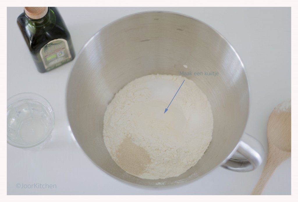 3. Schenk de eetlepel olijfolie in het kuiltje. Voeg daarna ook het water toe.