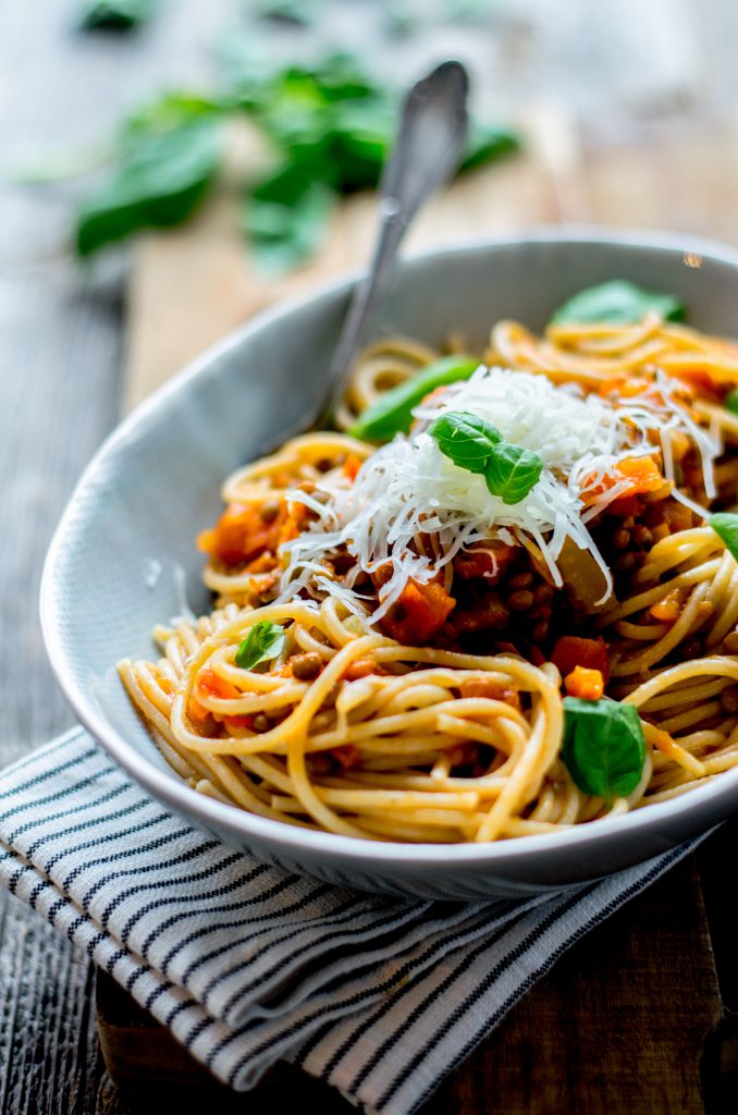 6. Schep een aantal scheppen tomaten-linzensaus door de spaghetti en roer goed door. Voeg eventueel wat kookwater toe als het te droog wordt. Schep de spaghetti vervolgens over de borden en verdeel de rest van de bolognesesaus eroverheen. Garneer met de blaadjes basilicum en de geraspte kaas.