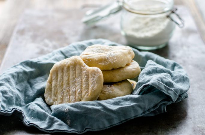 6. Verwarm in de tussentijd een pan die je lichtjes ingevet hebt met olie op middelhoog vuur. Doe per keer 1 broodje in de pan an gril deze 3 minuten per kant. Laat ze in die drie minuten volledig met rust. Als het goed is, komen je broodjes omhoog en ontstaan er luchtbubbels. Doe dit met ieder broodje.