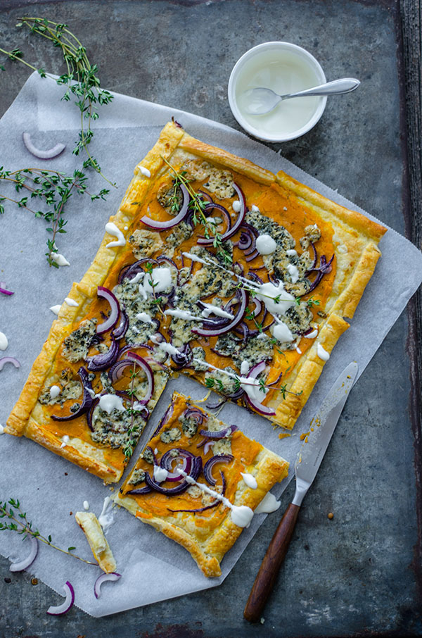 Ik ben fan van plaattaarten. Niet alleen omdat ze gewoon superlekker zijn (bladerdeeg – jammie!), maar ook omdat je ze heel snel op tafel hebt staan en ze ideaal zijn om restjes op te maken. Er staan inmiddels ook al twee heerlijke recepten voor plaattaart op het blog, deze simpele, zomerse plaattaart met courgette en mascarpone en deze hartige herfsttaart met rode bieten en blauwe kaas en nu werd het tijd voor een nieuw exemplaar: plaattaart met zoete aardappel en blauwe kaas.
