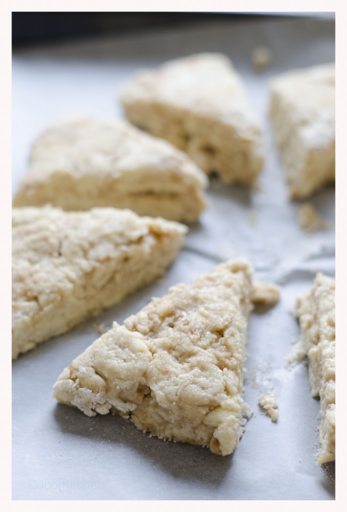 8. Bedek een bakplaat met een vel bakpapier en stort hier je mix op. Vorm nu met je handen een cirkel van het deeg. Het deeg is ongeveer 1,5 tot 2 centimeter dik. Druk goed aan. Snijd nu met een scherp mes de cirkel doormidden, dan in kwarten en tenslotte in achten. Haal de verschillende taartpunten een stukje naar achteren, ze rijzen namelijk best nog wat in de oven.