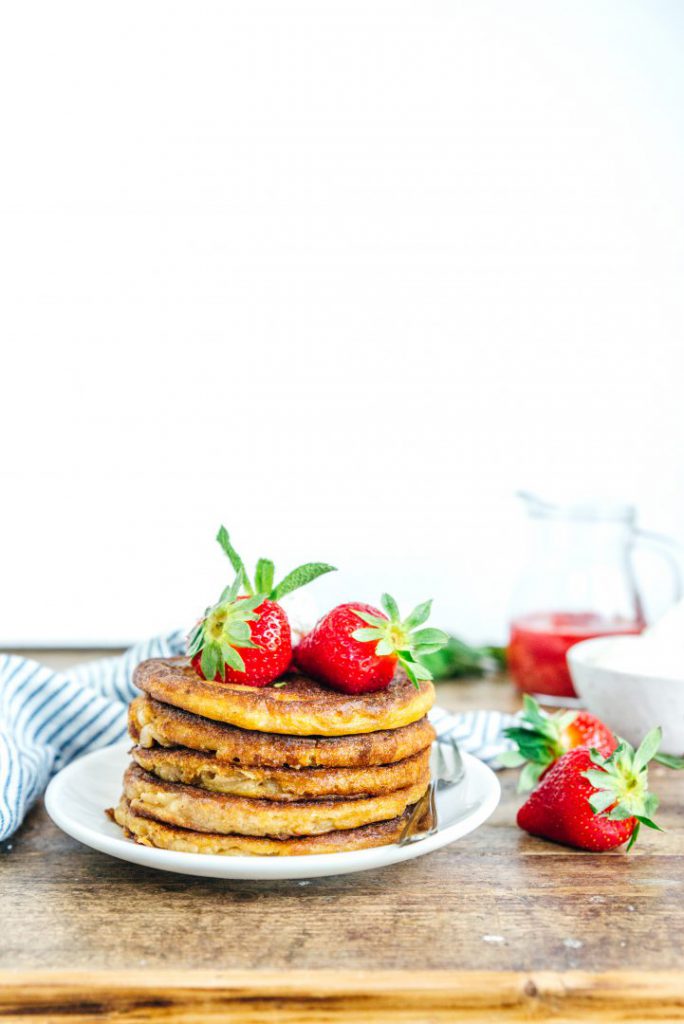 Ik ben er nog niet helemaal over uit waarom ik deze pannenkoeken nu zo lekker vind. Stiekem denk ik dat het komt vanwege de combinatie mascarpone-aardbeienjam, dat vind ik op scones namelijk ook niet te weerstaan. Maar juist de pannenkoeken erbij maakt dit recept echt heerlijk.