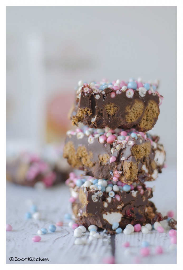 Geen zin in een kraamhapje met een Sinttwist? Vervang dan de pepernoten door koekjes. En wil je wel Rocky road maar geen kraamhapjes? Vervang dan de roze of blauwe muisjes door sprinkles of andere hagelslag. Enjoy!